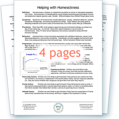 Distills cutting-edge, research-based information on the causes and symptoms of homesickness, as well as sample dialogues, training guidelines, and the most effective treatments camp staff can use. Bundle with “Guidelines for Considering a Shortened Stay.”