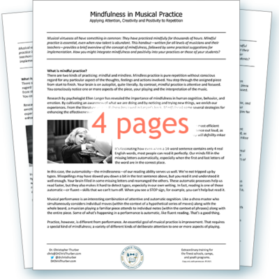 Musical virtuosos all have something in common: They have practiced mindfully for thousands of hours. This handout—written for all levels of musicians and their teachers—provides a brief overview of the concept of mindfulness, followed by practical suggestions for implementation.