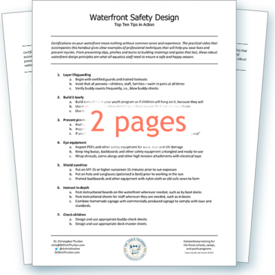 Certifications on your waterfront mean nothing without common sense and experience. This handout outlines techniques that will help save lives and prevent injuries. From preventing slips and pinches to building moorings and gates that last, this is what all aquatic staff need.